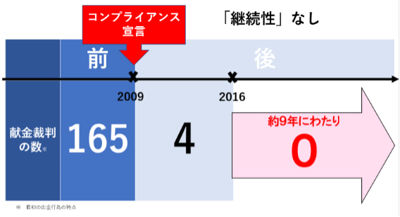 その後のコンプライアンス宣言により家庭連合は組織を改善し、同宣言後の献金についてはこれまで9年間で1件も提訴されていません。このように、安倍暗殺事件の前は、家庭連合が解散するおそれは微塵もなかったのです。