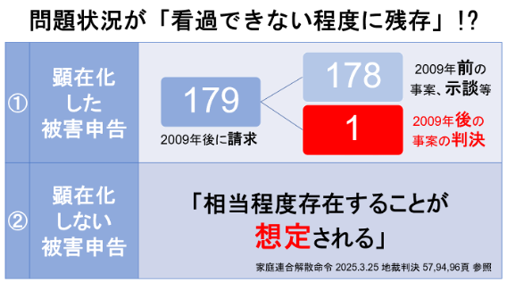 次に、百歩譲ってそのような「合理的」な推測が許されるとして、その問題の状況が今どれだけ残存しているかの程度(上記2)につき、裁判所は大きく論理を飛躍させます。裁判所は、顕在化した179件の被害申告(うちコンプライアンス宣言後の事案の判決は家庭連合調査では1件のみ)のみならず、潜在的な被害申告が「相当程度存在することが想定される」ため、今もなお看過できない程度に問題が残存していると判断しました。