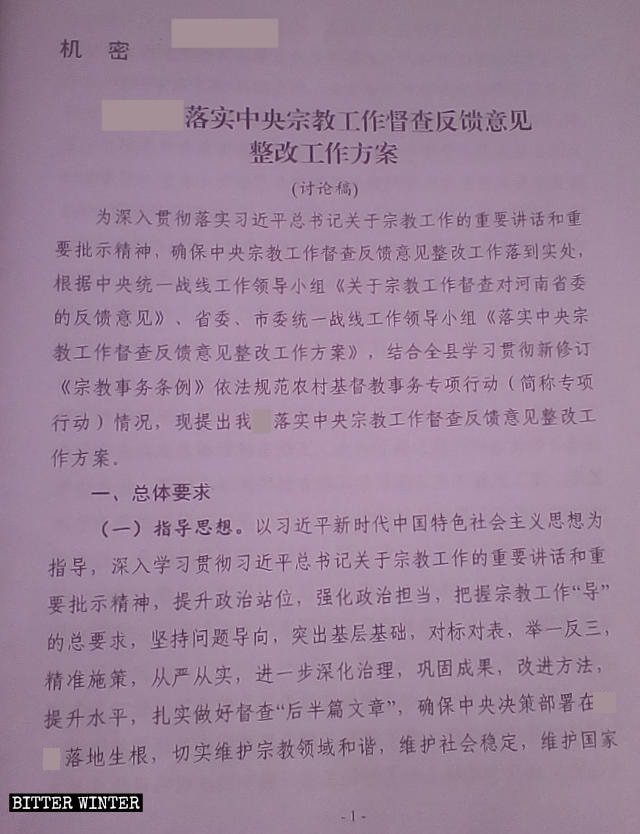 - A confidential document about cracking down on religious belief, issued by a locality in Henan.