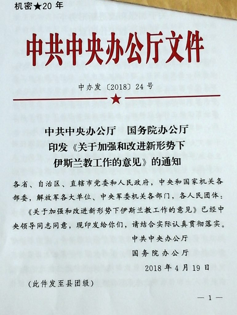 Bitter Winter has received a copy of a confidential circular letter titled “Suggestions on Strengthening and Improving Islamic Work Under the New Circumstances,” issued on April 19, 2018, by the General Office of the Central Committee of the Communist Party of China and the General Office of the State Council of the People’s Republic of China.
