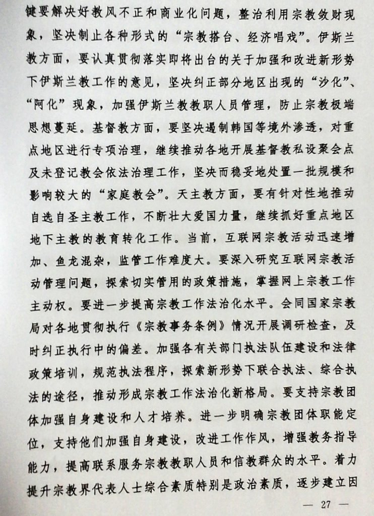 This circular suggests to “focus on improving the comprehensive caliber of religious representatives, political caliber in particular, gradually establish a religious talent development scheme that would differ according to different religions but should also be relatively consistent, and make sure the leadership of religions is in the firm grip of the people that love the country and the religion.” The circular asks to “instruct the China Tibetan Language High Institute of Buddhism and the institutes of Buddhism in four provinces and one autonomous region to strengthen their standardization construction, steadily promote the work of cultivation and training of religious talents in Xinjiang, and guide them to adhere without wavering to the direction of sinicization of religions of our country.”